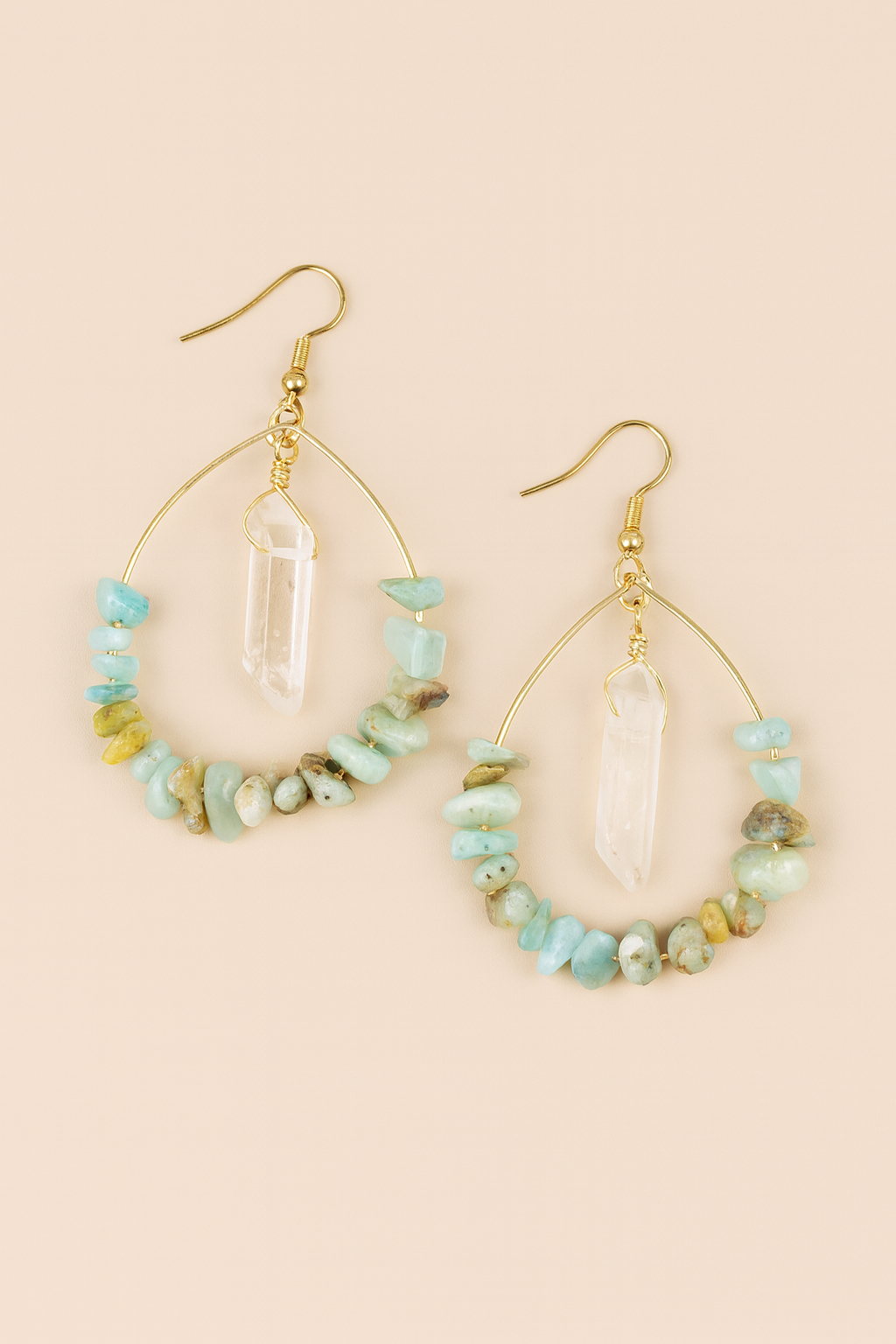 Handcrafted hoop earrings adorned with soothing amazonite gemstone chips and finished with clear quartz crystal pendants. Amazonite is known for its calming, balancing energy, while quartz amplifies clarity and positive vibes. Lightweight and earthy, these earrings bring a touch of boho elegance and natural harmony to any outfit.