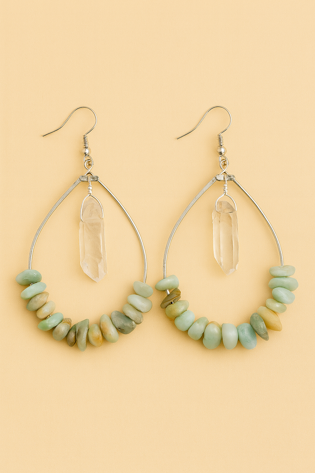 Handcrafted hoop earrings adorned with soothing amazonite gemstone chips and finished with a clear quartz point pendant. The calming aqua tones of amazonite pair beautifully with the clarity of quartz, creating a unique boho-chic design. Lightweight and eye-catching, these earrings bring both elegance and natural energy to any outfit.