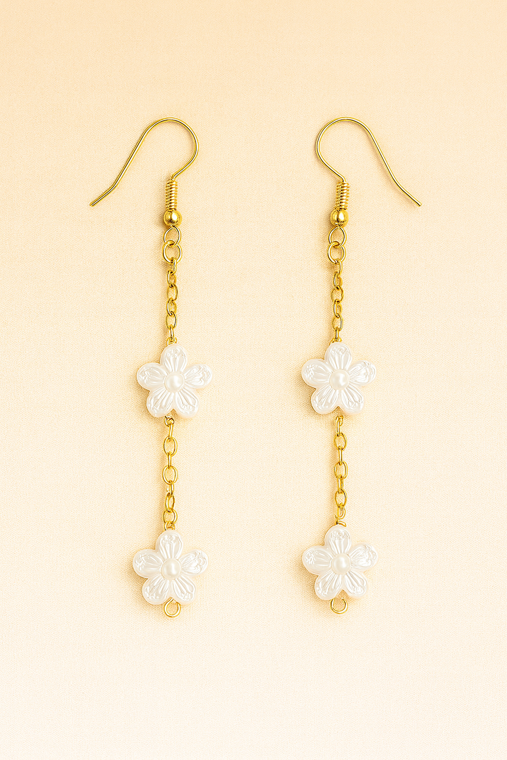 Delicate handmade earrings featuring gold chain links adorned with carved white floral charms. Lightweight and elegant, these earrings capture a fresh, feminine look that’s perfect for both everyday wear and special occasions.
