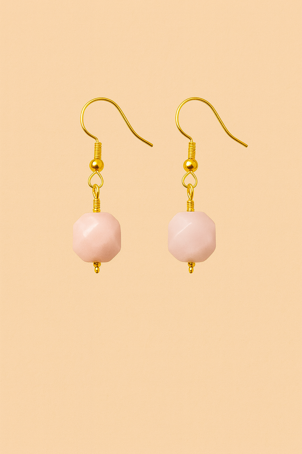 These elegant dangle earrings feature soft faceted rose quartz beads suspended from radiant gold hooks. Their delicate blush tones and minimalist design make them the perfect blend of timeless elegance and gentle healing energy, ideal for everyday wear or special occasions.