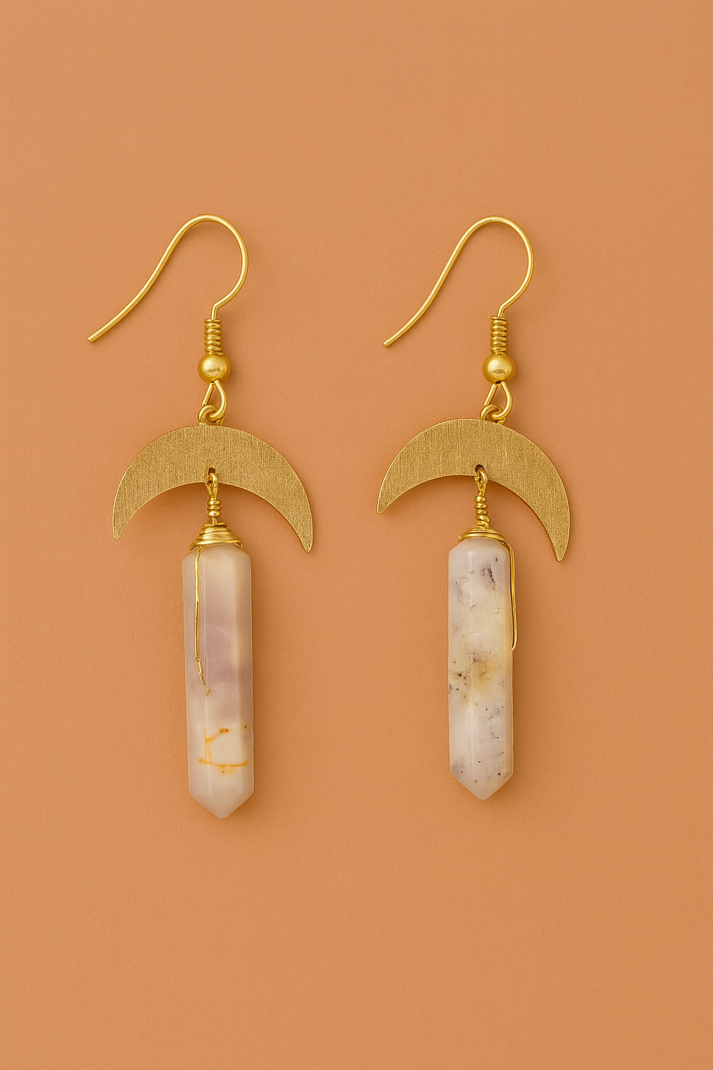 These enchanting earrings feature golden crescent moons paired with natural hexagonal gemstone drops. A perfect balance of celestial charm and earthy elegance, ideal for adding a mystical touch to any outfit.