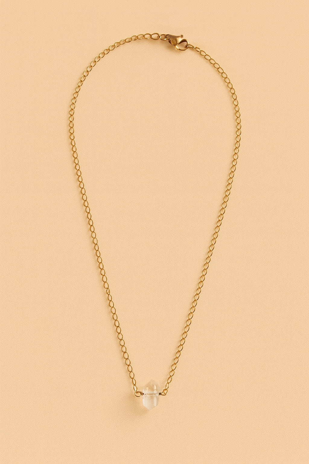 A delicate gold chain adorned with a raw clear quartz crystal, symbolizing clarity and balance. Perfect for everyday wear or layering, this minimalist piece adds a touch of natural elegance and timeless charm to any outfit.