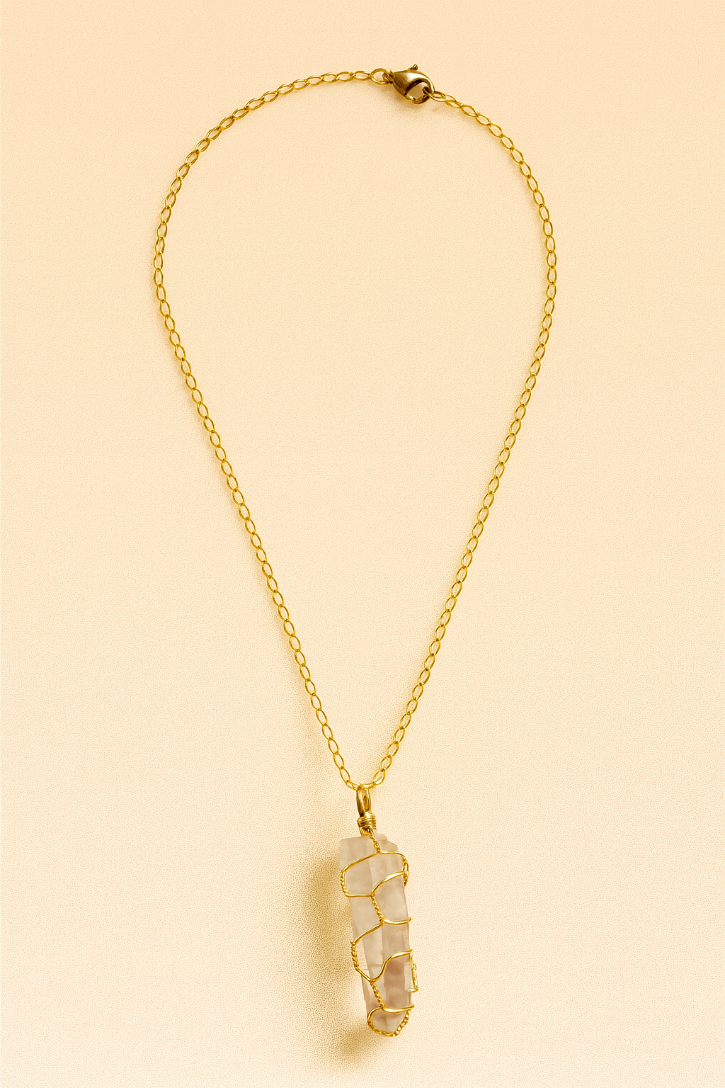 A radiant necklace featuring a raw clear quartz crystal wrapped in delicate gold wire, suspended from a fine gold chain. The warm golden tones beautifully complement the crystal’s natural clarity, making it a versatile piece that exudes both elegance and earthy charm. Perfect for adding a touch of sophistication to everyday wear or as a standout accessory for special occasions.
