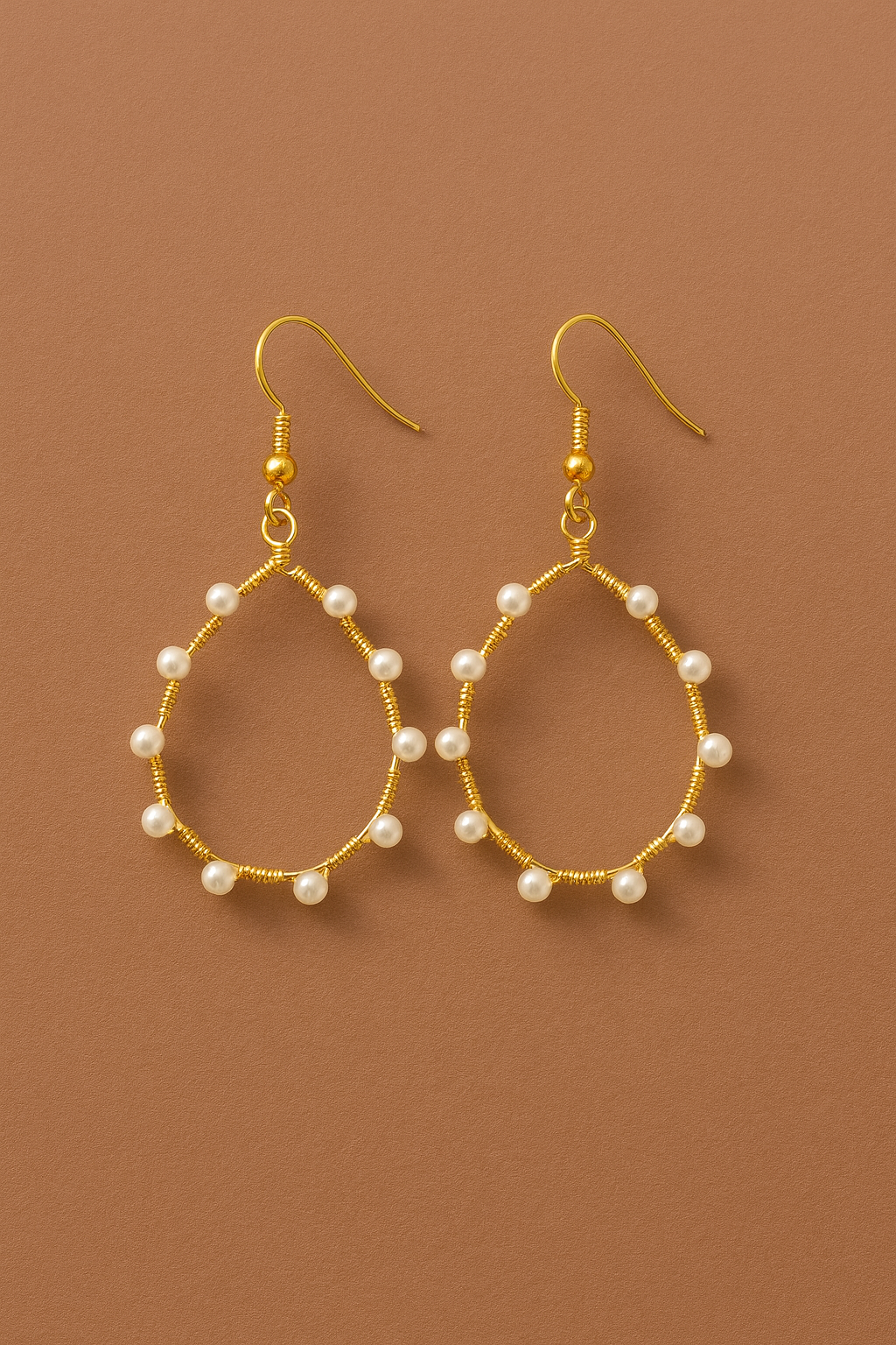 These handcrafted teardrop-shaped hoops feature radiant gold wire adorned with delicate white pearls. Elegant and versatile, they blend timeless sophistication with modern charm, making them the perfect accessory for both casual days and special occasions.