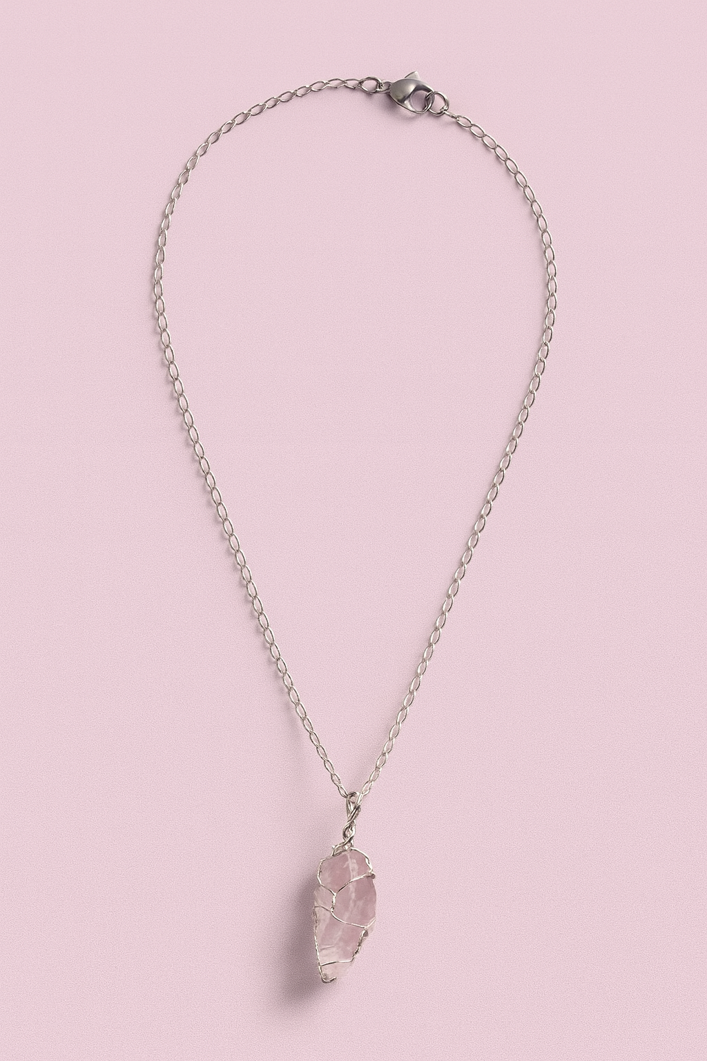 This elegant necklace features a raw rose quartz crystal delicately wrapped in silver wire, suspended from a fine silver chain. The natural pink hue of the stone radiates soft, calming energy, while the handcrafted wire wrapping adds a unique artisanal touch. A perfect piece for those who love minimalist jewelry with a touch of natural beauty.
