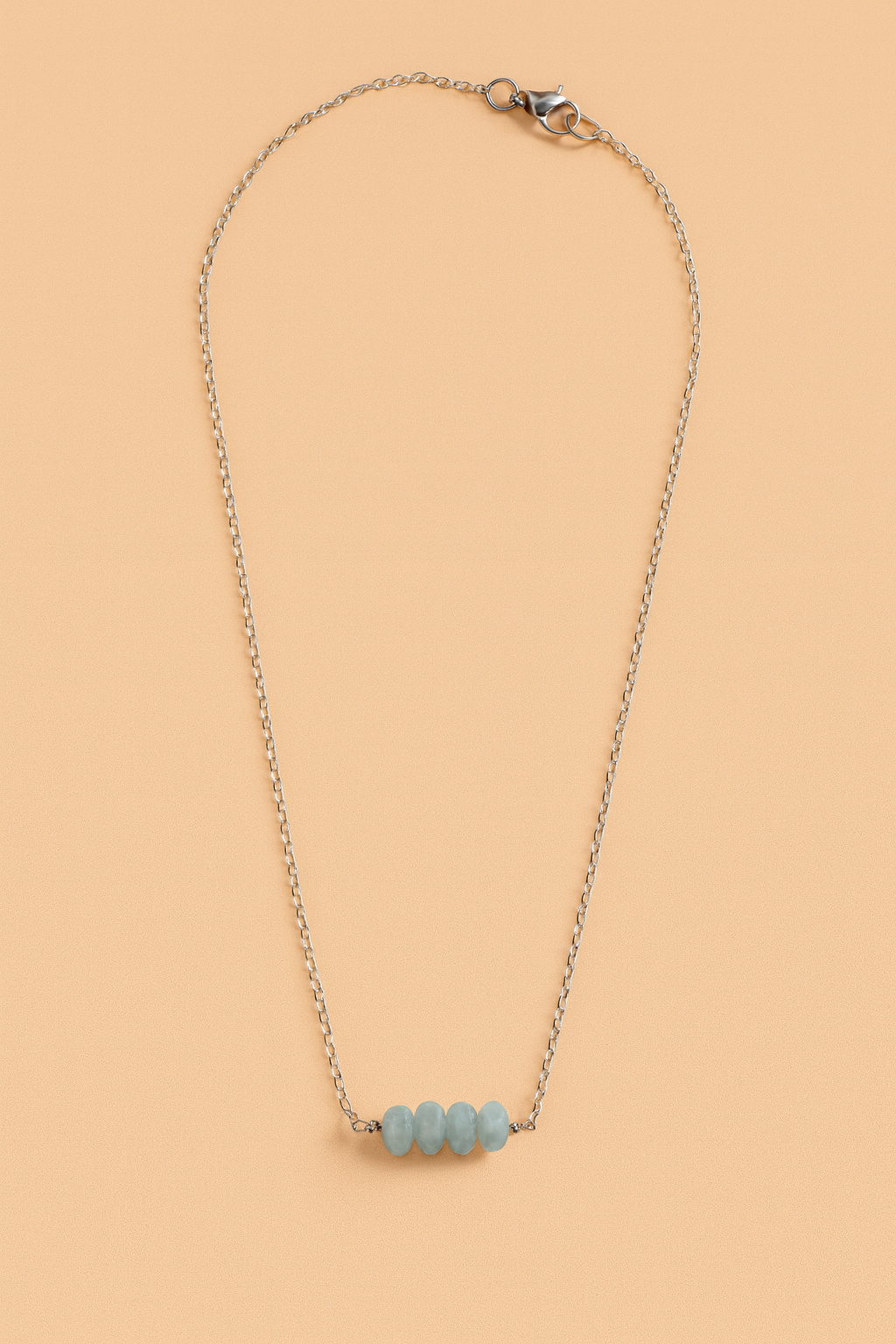 A minimalist silver chain necklace featuring five faceted aquamarine beads in soothing shades of blue-green. The clean, modern design makes it versatile enough for everyday wear while still adding a touch of elegance and tranquility. Perfect for layering or as a simple statement on its own.