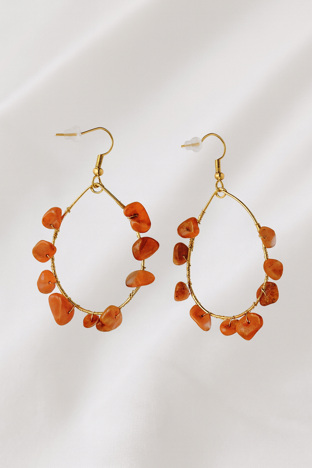 Lightweight handmade hoop earrings featuring natural carnelian gemstone chips on gold wire. Perfect for boho, casual, or evening wear. Unique and elegant, each pair highlights the warm orange glow of genuine carnelian stones.