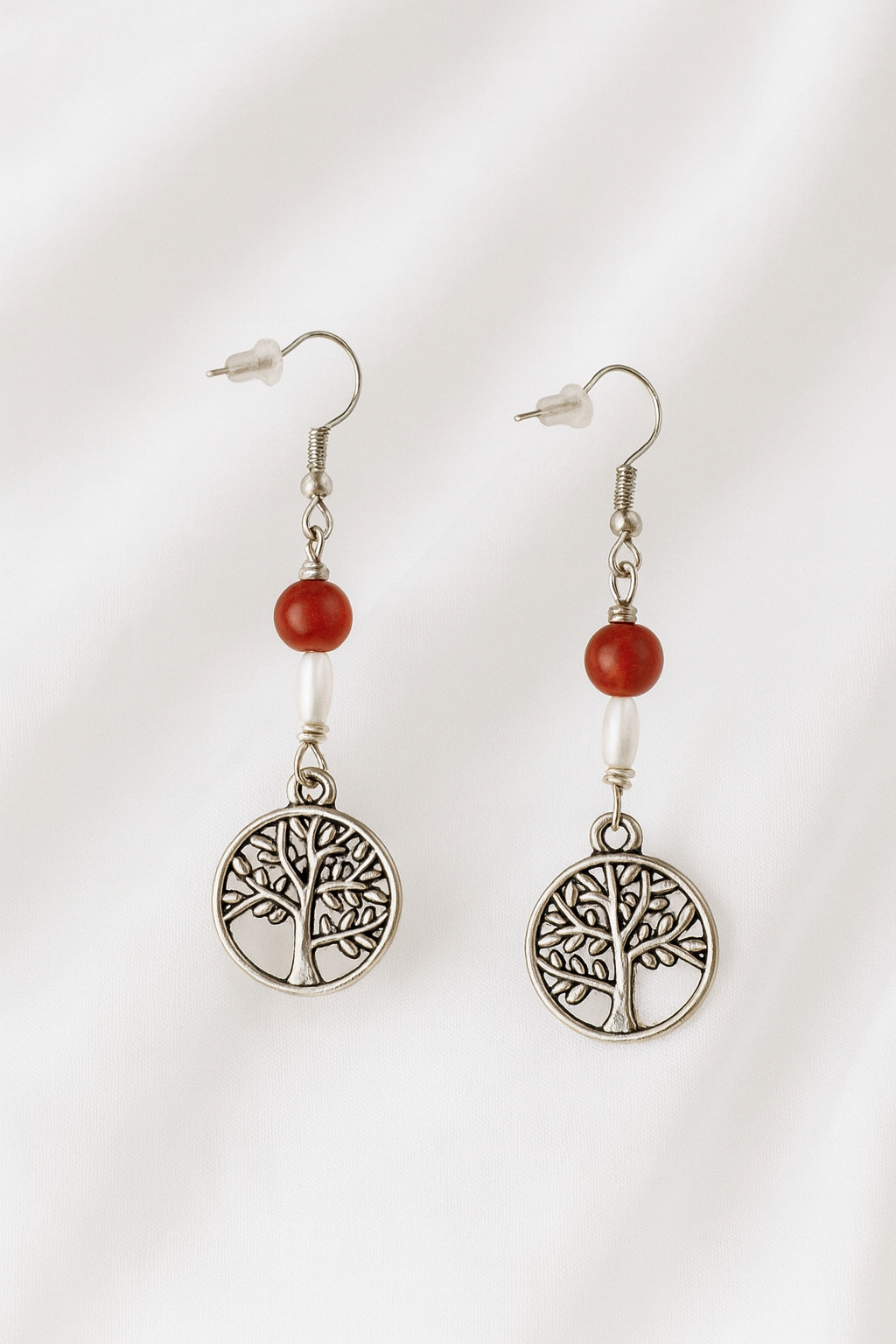 Elegant handmade earrings featuring silver-toned Tree of Life charms accented with deep red and white beads. Lightweight and meaningful, these earrings symbolize growth, strength, and harmony — perfect for everyday wear or as a thoughtful gift.