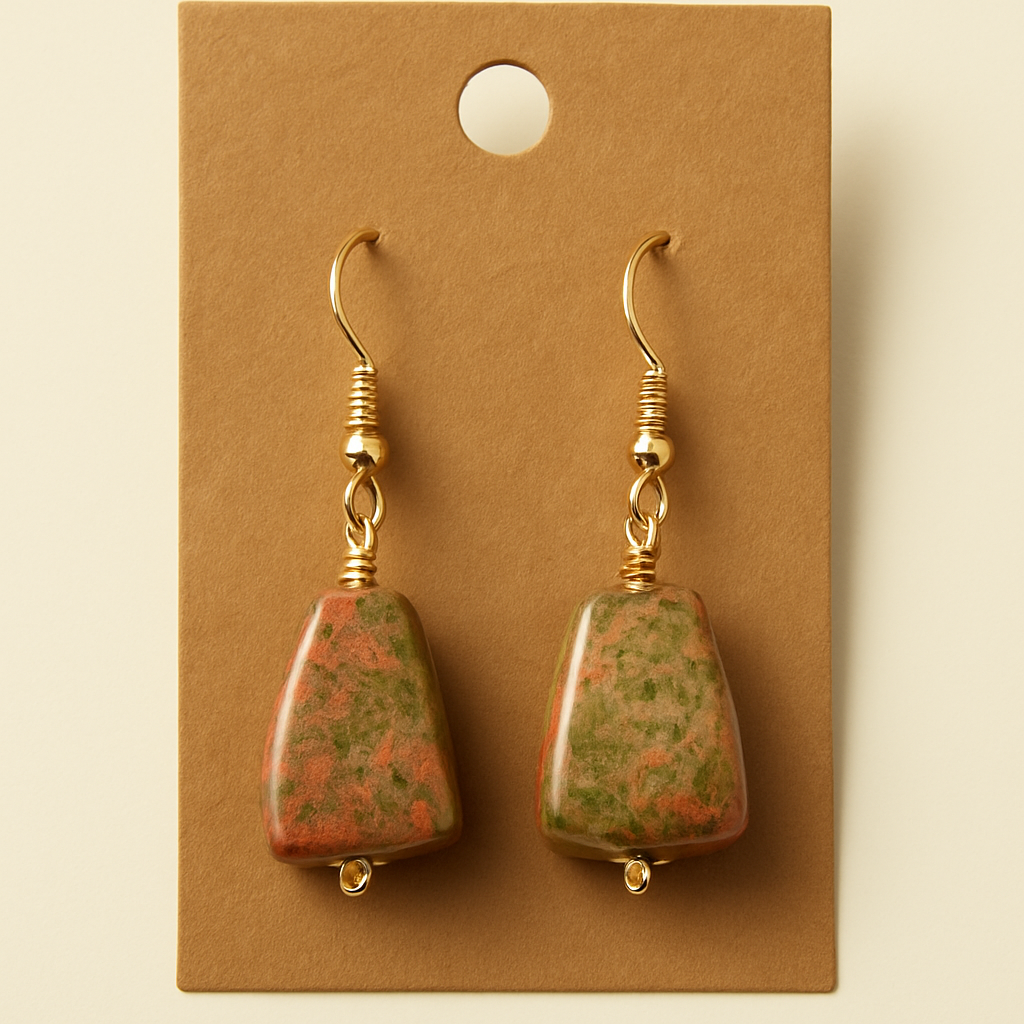 Handcrafted earrings featuring polished unakite gemstones in earthy green and warm red tones, wrapped in gold wire for a natural yet elegant finish. Known as a stone of balance and healing, unakite adds both grounding energy and timeless style, making these earrings perfect for everyday wear or meaningful gifting.