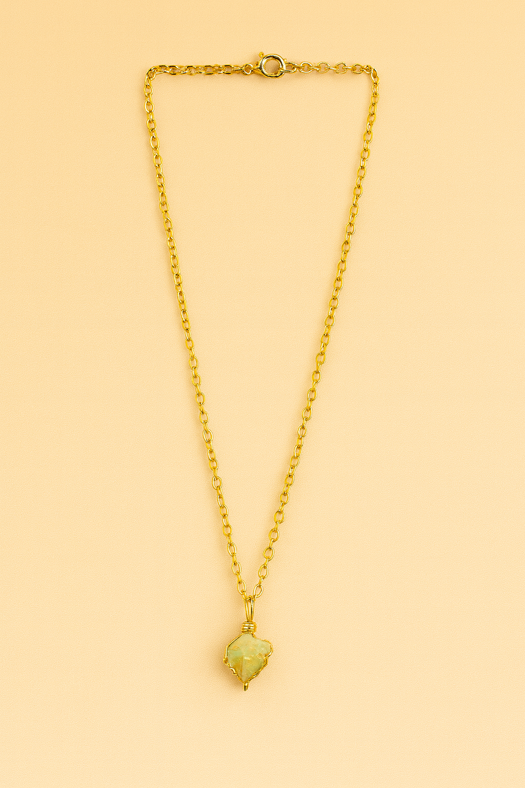 Handcrafted necklace with a raw green gemstone wrapped in gold wire on a delicate gold chain. Symbolizing healing, renewal, and balance, this timeless piece adds natural elegance to everyday wear or makes a meaningful gift.